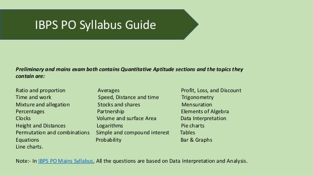 The syllabus can the three different stages of the exam can be summed up as follows. The IBPS PO Syllabus is determined by the Institute of Banking Personnel Selection IBPS. The first step for the examination is the preliminary test.